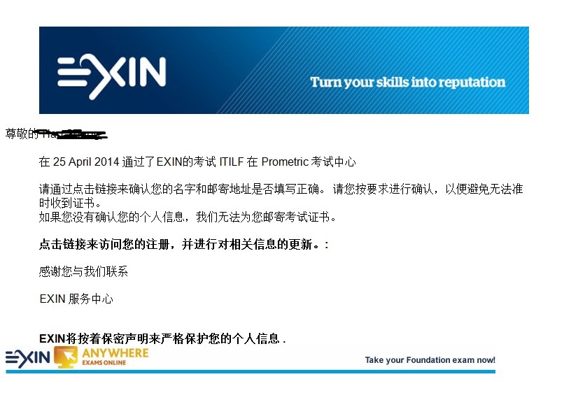 考试完后7天之内EXIN厂商会给考试发送一封个人信息的邮件,邮件里面会有一个连接,点击连接进去核对下个人信息就可以了。邮件如下图: