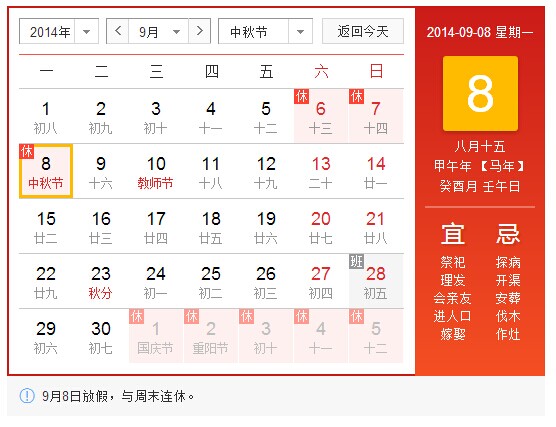 中秋节放假三天,假期时间为:9月6日、9月7日、9月8日。 9月9日(周二)正常上班。