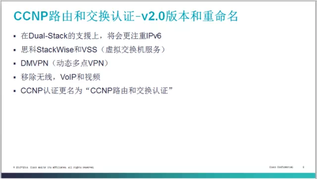 更新后的课程将更侧重于对IPv6的技术培训,考试也将更多考察考生对IPv6的掌握。基于动手实验室的的内容将帮助考生学习实际工作中将涉及的IPv6技能。课程还支持包括思科StackWise和VSS(虚拟交换机服务)和DM(动态多点)VPN的服务。由于认证更注重于对路由和交换技术的考察,思科把CCNP认证重命名为CCNP路由和交换认证,与CCNA路由和交换认证和CCIE路由和交换认证的名称一致。