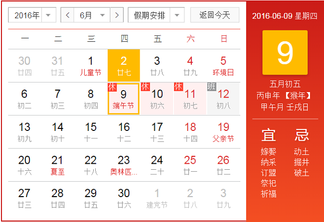 2016年6月9日放假安排时间表:2016年6月9日至2016年6月11日放假三天。6月12日正常上班!