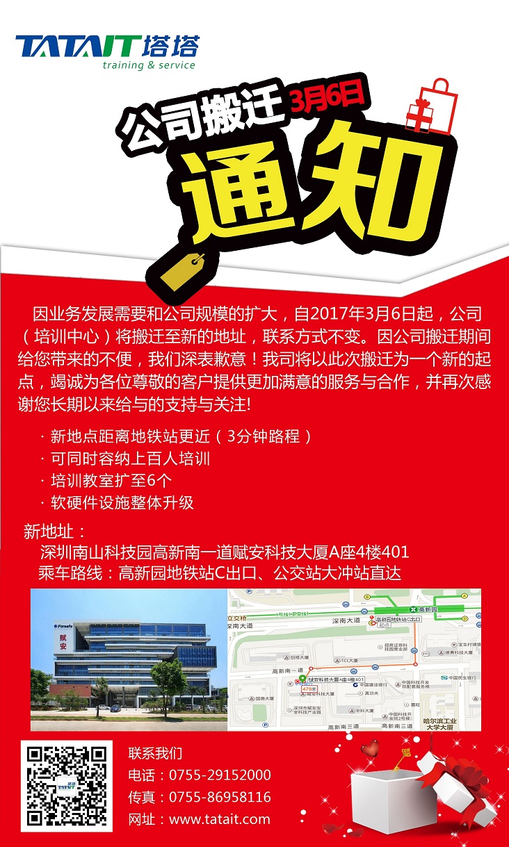 因业务发展需要和公司规模的扩大,自2017年3月6日起,公司(培训中心)喜迁新址办公(新办公地址附后)。搬迁期间,由于我司电话通讯线路的调试,可能会影响到您与我司正常的电话通话,因公司搬迁期间给您带来的不便,我们深表歉意!我司将以此次搬迁为一个新的起点,进一步为您提供更优质的产品和服务,与您共同发展,并再次感谢您长期以来给予本公司的支持与合作!