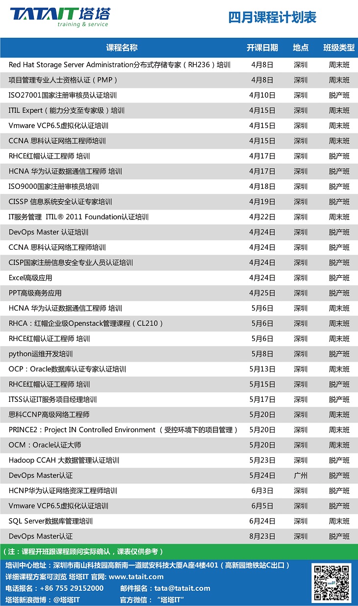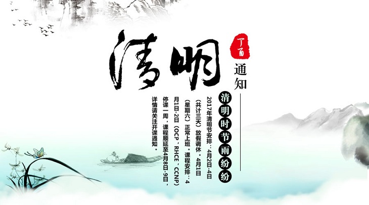 课程安排:4月1日-2日(OCP,RHCE,CCNP)停课一周,课程顺延至4月8日-9日,详情请关注开课通知。