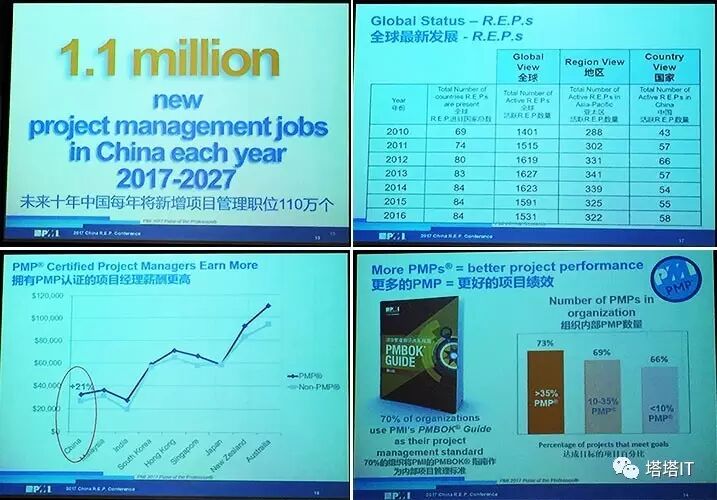 1999年PMI与国家外专局建立合作,把PMI系列课程引入中国,至今已有近18年,目前中国大陆持PMP有效证件人数有168300人次