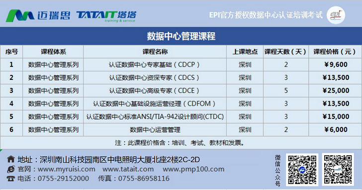 1.全球范围内的大型IT企业均采用此框架 2.培训交付由经验丰富的数据中心专业人士提供(EPI体系授权讲师严格挑选和控制数量) 3.由于重新认证的要求,能保证考生始终在领域内保持知识和专业度与时俱进 4.完整的覆盖范畴:从数据中心规划到灾难恢复,到危机管理沟通,等等