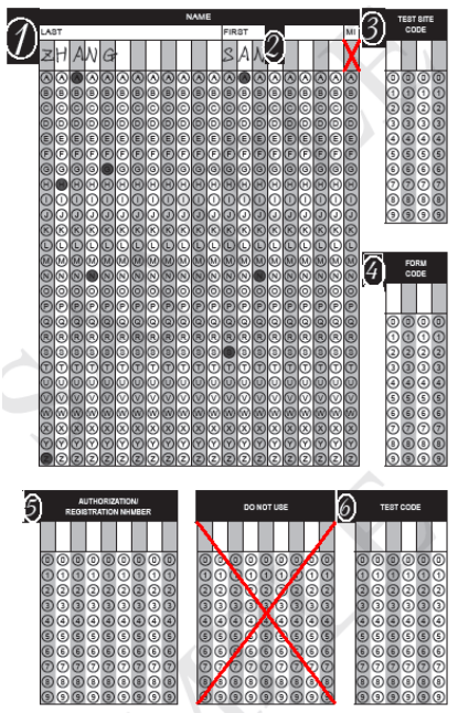 5)AUTHORIZATION /REGISTRATION NUMBER,填写座位标签上的⑤Authorization ID,从左往右填写,前面有零也要填写,并且将下面对应的数字涂黑。