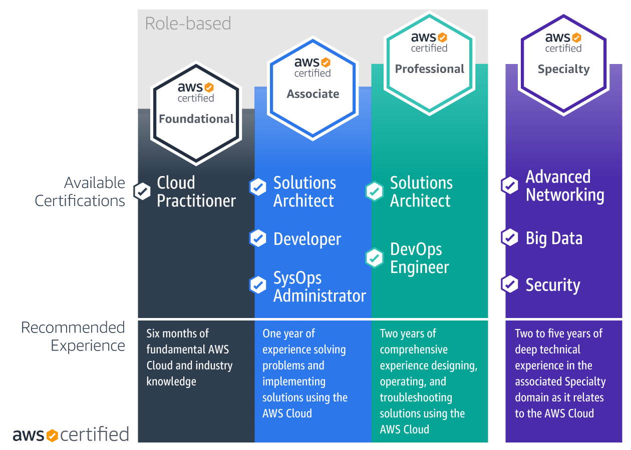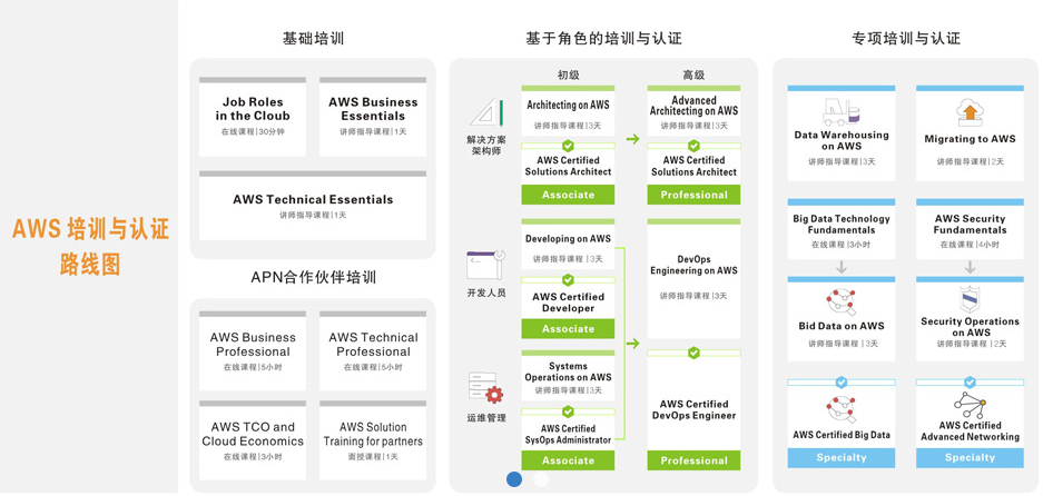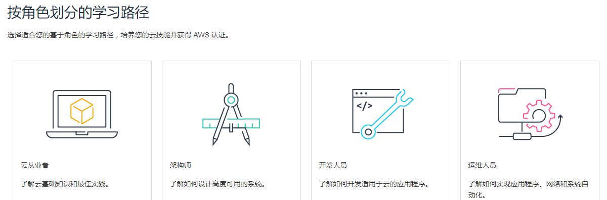 我们提供了用于验证担任云从业者、架构师、开发人员和运营职位的人员的专业知识的基于角色的认证,以及用于验证特定技术领域中的高级技能的专业认证。查看我们的学习路径以查找可帮助您培养技能和准备 AWS Certification 的培训。